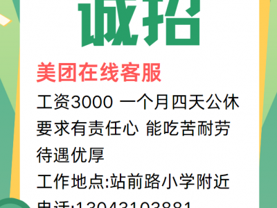 招聘美团在线客服,工资3000 。一个月四天公休。要求有责任心 能吃苦耐劳 待遇优厚工作地点:站前路小学附近