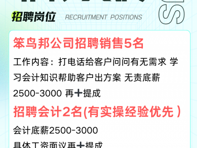 福利:双休五险,免费培训会计,可以接送小孩儿。有销售经验优先,最低学历高中