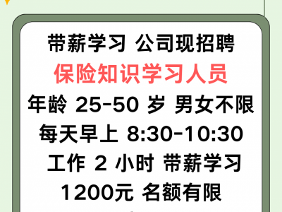 公司现招聘保险知识学习人员:年龄 25-50 岁,男女不限, 每天早上 8:30 到 10:30 工作 2 小时,带薪学习 1200元,名额有限,只限广平本地。地址:广平县第三中学南边200米路西泰康人寿
