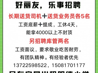 广平玮清商贸代理双汇低温,米多奇,好丽友,乐事招聘长期送货司机➕送货业务员各5名,工资底薪➕提成,工休4天,能拿4000以上不封顶,另招聘库管两名工资面议,要求敬业吃苦耐劳,有团队精神。有经验者优先,13722598522,15081701177另有房屋出租,明德小学周边,地理位置优越,