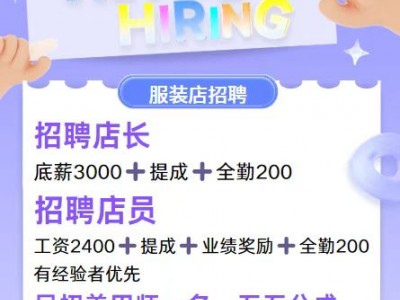广平婉楸服装店招聘店员,店长,店长工资,底薪3000➕提成➕全勤200,店员2400➕提成➕业绩奖励➕全勤200,有经验者优先,另招美甲师一名,五五分成,没有事时候也可以卖衣服,件提,有意者联系