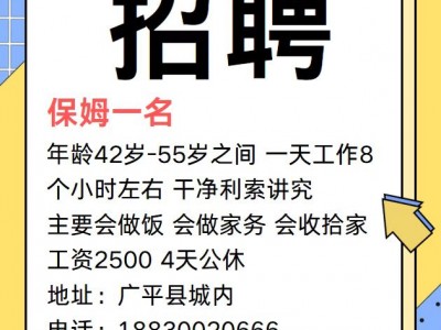 找保姆一名,年龄42岁-55岁之间,一天工作8个小时左右,干净利索讲究,主要会做饭,会做家务,会收拾家。工资2500,4天公休 地址:广平县城内
