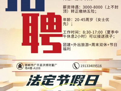 劳务公司招聘业务专员 底薪+提成+补助 月综合工资3000-8000上不封顶 长白班八小时工作制双休 年龄20-45周岁女士优先 转正缴纳五险 法定节假日+节假日福利+定期外出旅游+双休 团队氛围非常棒,欢迎加入!