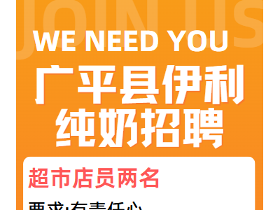 广平县伊利纯奶招聘超市店员两名,要求:有责任心。工资2500+公休,另招乡镇送货司机两名,工资4500-7500