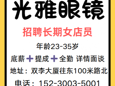 光雅眼镜招聘长期女店员,年龄23——35岁。底薪➕提成➕全勤。详情面谈。地址:双李大厦往东100米路北