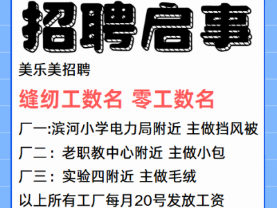 缝纫工数名,零工数名,厂一:滨河小学电力局附近,主做挡风被。厂二:老职教中心附近,主做小包。厂三:实验四附近,主做毛绒。以上所有工厂每月20号发放工资。联系电话:15188834639。15631480901