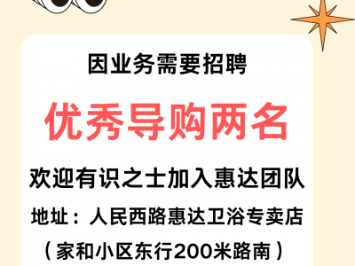 惠达卫浴因业务需要招聘优秀导购两名,欢迎有识之士加入惠达团队