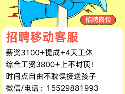 招聘移动客服 薪资3100+提成+4天工休