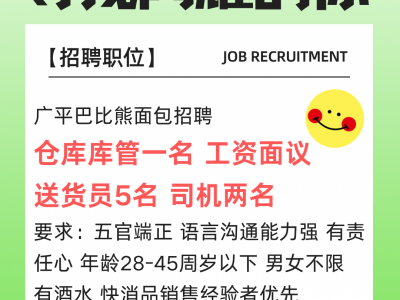 招聘信息 :广平巴比熊面包招聘 仓库库管一名 工资面议 送货员5名 司机两名
