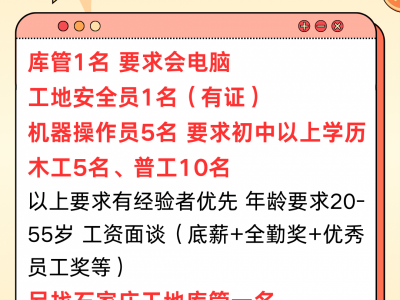 广平县芃韬木业有限公司(家具厂):库管1名,要求会电脑,工地安全员1名(有证),机器操作员5名,要求初中以上学历,木工5名、普工10名,以上要求有经验者优先。年龄要求20-55岁,工资面谈(底薪+全勤奖+优秀员工奖等)。另找石家庄工地库管一名要求60岁以下(男)识字即可。地址:广平县城南开发区昆山东路南段