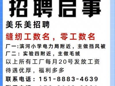 缝纫工数名,零工数名,厂一:滨河小学电力局附近,主做挡风被。厂二:实验四附近,主做毛绒。以上所有工厂每月20号发放工资。待遇优厚,福利多多,联系电话:15188834639。15631480901