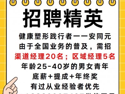 健康塑形践行者一一安同元,由于全国业务的普及,需招渠道经理20名;区域经理5名。年龄25--40岁的男女青年,底薪+提成+年终奖,有过从业经验者优先