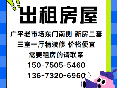 出租房屋,广平老市场东门南侧,新房二套,三室一厅精装修,价格便宜。需要租房的请联系,电话:15075055460,13673206960