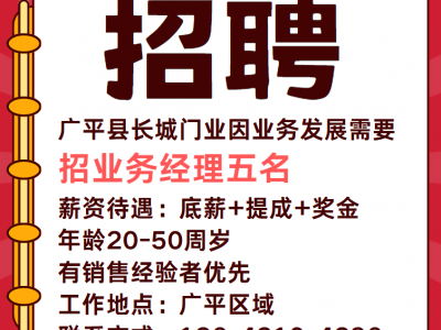 广平县长城门业因业务发展需要,招业务经理五名,工作地点广平区域,薪资待遇:底薪+提成+奖金。