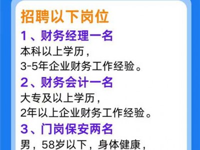 邯郸市新颐通管业科技有限公司招聘以下岗位1、财务经理一名,本科以上学历,3-5年企业财务工作经验。2、财务会计一名,大专及以上学历,2年以上企业财务工作经验。3、门岗保安两名,男,58岁以下,身体健康,能长期工作。以上岗位,待遇面议。