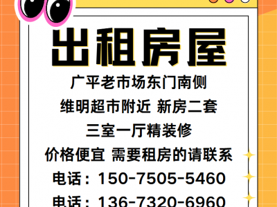 出租房屋,广平老市场东门南侧,维明超市附近,新房二套,三室一厅精装修,价格便宜。需要租房的请联系,电话:15075055460,13673206960