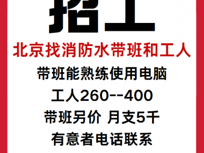北京找消防水带班和工人,带班能熟练使用电脑,工人260---400,带班另价,月支5千,有意者电话联系