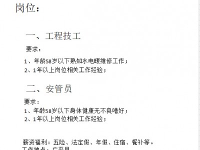 诚聘:一、工程技工 1、年龄58岁以下,有工作经验有电工资格证优先 2、具有良好的沟通能力和学习能力 二、安管员 1、身体健康无不良嗜好,年龄58岁以下 1、有岗位工作经验优先 工作地点:广平县万浩上城小区