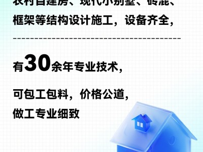 本施工队承接县城周边:农村自建房、现代小别墅、砖混、框架等结构设计施工,设备齐全,有30余年专业技术,可包工包料,价格公道,做工专业细致