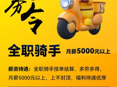 薪资待遇:全职骑手按单结算,多劳多得,月薪5000元以上,上不封顶,福利待遇优厚,有意者电话联系