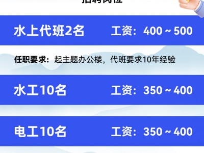 需要水上代班2名 起主题办公楼,(代班要求10年经验,工资400~500)水工 10名、电工10名 (工资350 ~400)焊工5名 (工资380 ~450)