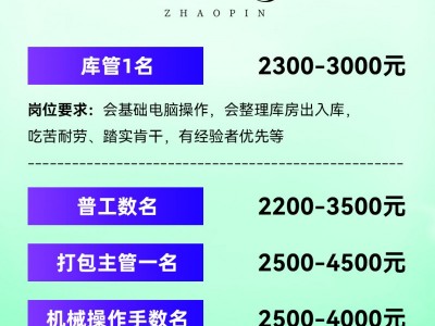 2300元-3000元,会基础电脑操作,会整理库房出入库,吃苦耐劳、踏实肯干,有经验者优先等