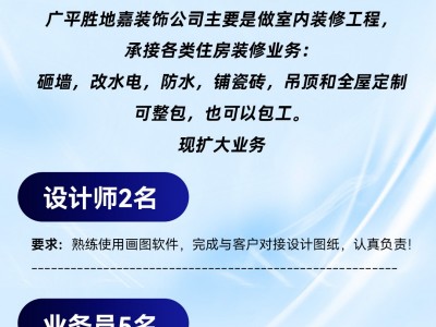 现扩大业务,需招聘设计师2名,要求熟练使用画图软件,完成与客户对接设计图纸,认真负责!