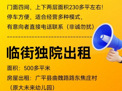 面积:500多平米 详情:房屋出租:广平县曲魏路路东焦庄村(原大未来幼儿园)院内一至三楼带小院出租,有意向者直接电话联系(非诚勿扰)