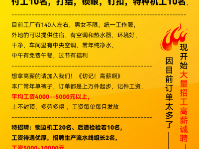 想拿高薪的请加入我们!《切记!高薪啊》本厂常年单裤子,订单都是上万件起步,记件工资,平均工资4000 ---5000元以上,上不封顶,多劳多得 ,工资每单每月发放
