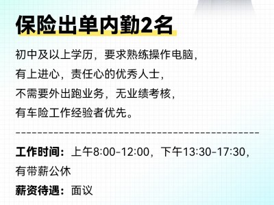 招聘保险出单内勤2名,初中及以上学历,要求熟练操作电脑,有上进心,责任心的优秀人士,不需要外出跑业务,无业绩考核,有车险工作经验者优先。工作时间:上午8:00-12:00,下午13:30-17:30,有带薪公休