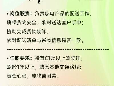 • 岗位职责:负责家电产品的配送工作,确保货物安全、准时送达客户手中;协助完成货物装卸,核对配送清单与货物信息是否一致。