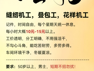 记件,时间自由,每个星期天统一休息。每小时大概10元-15元以上。工价透明,分工明确,不用强活干,不勾心斗角,能吃苦耐劳,多劳多得。车间环境干净,冬暖夏凉。要求 50岁以上,男士,短期不招勿扰!
