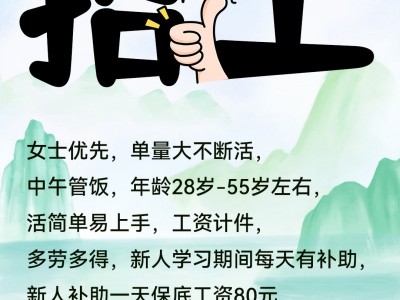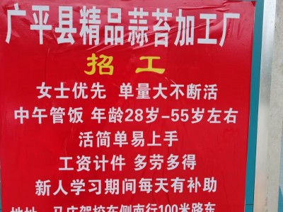 广平县精品蒜苔加工厂招工,女士优先,单量大不断活,中午管饭,年龄28岁-55岁左右,活简单易上手,工资计件,多劳多得,新人学习期间每天有补助,新人补助一天保底工资80元,