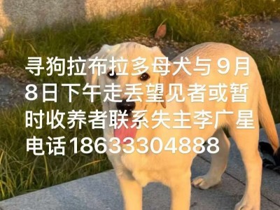 寻狗拉布拉多女犬与9月8号下午走丢望见者或收养者联系失主李广星