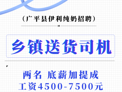 广平县伊利纯奶招聘;乡镇送货司机两名
