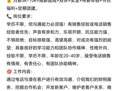【急聘】财税电话销售 公司主要做代理记账,公司和个体注册注销,资质证件办理,银行社保开户、生产许可证、税务异常解除等相关业务的。 月薪3k-10k+高薪提成+双休+奖金+带薪年假+节日福利+定期团建。 岗位要求: 学历不限,但沟通能力必须强!有销售经验或电话销售经验者优先;声音有亲和力,乐观开朗,抗压能力强,不惧拒绝;目标感极强,渴望高薪,对成功有强烈的欲望;具备良好的学习能力和团队协作精神、性格外向,经验不限,学历不限,年龄在20-40岁,接受电话销售有情商,有责任心,有团队协助精神。 O工作内容: 通过电话与潜在客户进行有效沟通,介绍我们的财税服务,挖掘合作机会;开发新客户,维护老客户关系,精准记录客户需求,并与顾问团队协作,为客户提供解决方案;收集市场信息,不断优化销售话术和技巧。工作地点:导航搜索领路会计 高薪资+简单氛围+晋升快!欢迎加入!