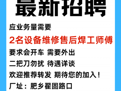 应业务量需要2名设备维修售后焊工师傅,要求会开车,需要外出(二把刀勿扰)