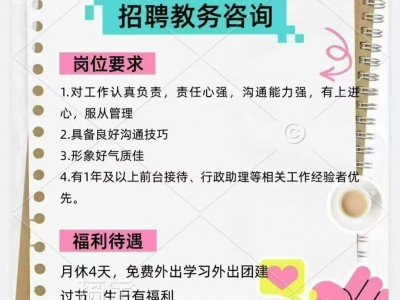 ✨校区扩招!教务咨询3个名额 因校区发展加速,急需3位靠谱教务咨询加入~ 日常负责访客接待、咨询引导,工作环境轻松,团队氛围超融洽! 只要你认真负责、沟通力强,懂点基础办公技能,欢迎咨询 有意咨询高老师
