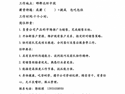 招聘岗位:销售人员(钢结构围护产品等金属制品)年龄18-40周岁,男女均可。有销售经验可以外出者优先。 工作地点:邯郸北环中段 薪资待遇:底薪()+提成包吃包住 工作时间:十个小时。 岗位职责: 1.负责公司产品的市场推广与销售,完成销售目标。 2.开拓新客户资源,维护现有客户关系,指定针对销售策略。 3.协同团队完成项目跟进、合同签订及售后服务等工作。 任职要求: 1.具有良好的沟通能力、谈判技巧及团队协作精神。 2.有销售经验者优先,熟悉行业者更佳。 3.能接受高强度工作节奏,抗压能力强。 4.身体健康,吃苦耐劳,遵守公司劳动纪律,踏实肯干,有责任心,无不良嗜好,服从管理。 联系电话:郭经理 地址:邯郸市北环与107国道交叉口西行100米路北