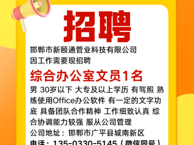 邯郸市新颐通管业科技有限公司因工作需要现招聘综合办公室文员1名,男,30岁以下,大专及以上学历,有驾照,熟练使用Office办公软件,有一定的文字功底,具备团队合作精神,工作细致认真,综合协调能力较强,服从公司管理。
