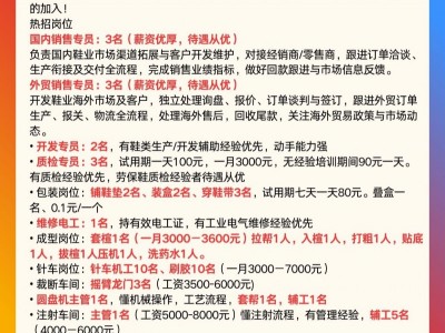 • 开发专员:2名,有鞋类生产/开发辅助经验优先,动手能力强