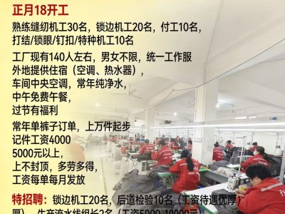 广平县腾飞制衣因订单太多了,正月18开工,现开始大量招工高薪诚聘熟练缝纫机工30名,锁边机工20名,付工10名,打结,锁眼,钉扣,特种机工10名,目前工厂有140人左右,男女不限,统一工作服,外地的可以提供住宿,有空调和热水器,环境好,干净,车间里有中央空调,常年纯净水,中午有免费午餐,过节有福利