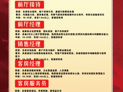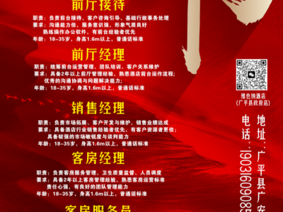 年已过,岗已备,就等你! 客房、前台、保洁、服务员等多岗位火热招聘中,男女不限,生手可学。 工作环境干净舒适,晋升空间大 年已过,岗已备,就等踏实肯干的你! 有意者请直接联系: 工作地址:广平县广安西路369号维也纳酒店