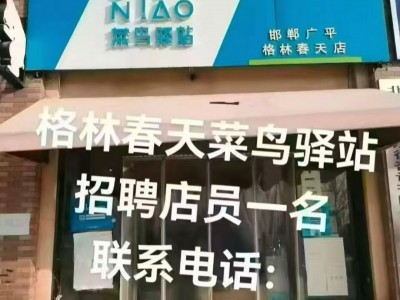 格林春天南门菜鸟驿站招聘店员。