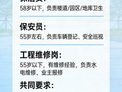 【安居广运府小区物业直招】 因工作需要,现面向小区及周边诚招以下岗位: 工程维修岗 •要求:55岁左右,有维修经验,负责水电维修、业主报修 保洁员 •要求:58岁以下,负责楼道/园区/地库卫生 保安员 •要求:55岁左右,负责车辆登记、安全巡视 ✅共同要求:身体健康,干活利索,无不良嗜好,有责任心!