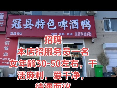 广平(冠县特色啤酒鸭)急找一名女服员,要求干净利索,工资面议,工作地点:嘉通小区北门