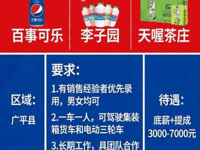 百事可乐李子园天喔茶庄诚聘销售精英 区域:广平县 要求:1.有销售经验者优先录用,男女均可 2.一车一人,可以驾驶集装箱货车和电动三轮车 3.可以长期工作,具有团队合作精神 待遇:底薪➕提成3000-7000元 电话: 短期勿扰