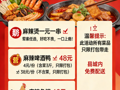 新品上❤麻辣烫一元一串 [烟花]新品上新,实惠到家[烟花] 麻辣烫一元一串 荤素任选,好吃不贵,一口上瘾! 麻辣啤酒鸭 ✅48元/份(含菜3斤,只限打包) ✅38元/份(不含菜,只限打包) 麻辣鱼锅68元 鸡锅58元 (均含菜3斤,只限打包) ⚠️温馨提示: 此活动所有菜品只限打包带走 县城内免费配送 想吃好味不用等,下单即送上门~